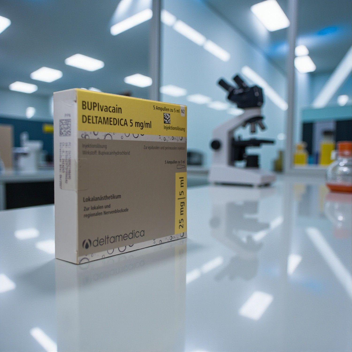 Bupivacain DELTAMEDICA 5 mg/ml Injektionslösung ist eine sterile, gebrauchsfertige Injektionslösung zur gezielten intravenösen und regionalen Anesthesie bei Nervenblockadetechniken bei Erwachsenen und Kindern. Die hochwertige Formulierung bietet durch 100% Bioverfügbarkeit und exzellente Gewebepenetration eine wirksame Schmerzausschaltung bei regionalen Anästhesieverfahren. Mit flexibler Dosierungsanpassung und bewährtem Wirkspektrum gegen Schmerzen bei Operationen und interventionellen Verfahren stellt sie eine zuverlässige Lösung für die klinische Praxis dar.